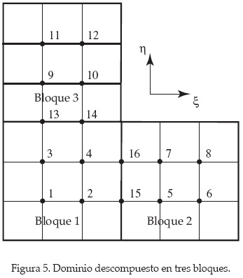 Para ejemplificar el proceso de discretización utilizando una malla compuesta, se analiza el caso indicado en la figura 5, correspondiente a un dominio que se ha descompuesto en tres bloques. Los nodos se numeran consecutivamente, incluyendo los de la interfaz. Con esta numeración se obtiene el sistema de ecuaciones:
