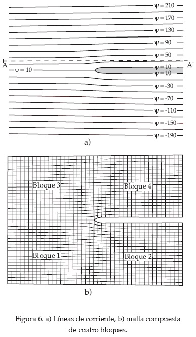 donde U es la velocidad del flujo uniforme y q es el caudal unitario en la fuente. Con (30) se obtienen las líneas de corriente indicadas en la figura 6a, donde se utiliza U = 2 m/s y q = 20 m2/s. El dominio empleado para la solución numérica es el delimitado por las líneas de corriente ψ =-190 m2/s en el sur, ψ = 210 m2/s en el norte, y por las rectas x = 140 m en el este, y x =-140 m en el oeste. En el norte y sur se tienen fronteras tipo Dirichlet, mientras que en el este y oeste son tipo Newman. La parte correspondiente al obstáculo se maneja como Dirichlet con ψ = 10 m2/s. Se emplean cuatro bloques para discretizar el dominio, tal como se indica en la figura 6b.