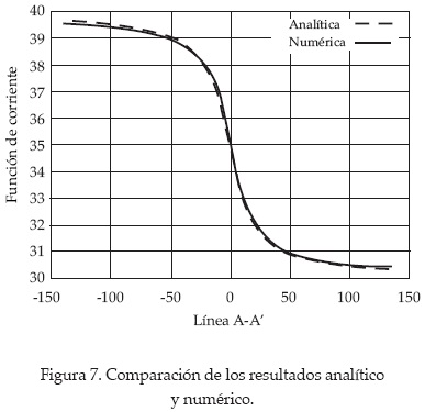 Se compara la solución analítica con la obtenida numéricamente en la recta A-A', indicada en la figura 6a. Los resultados analítico y numérico se muestran en la figura 7; en términos prácticos, son los mismos.
