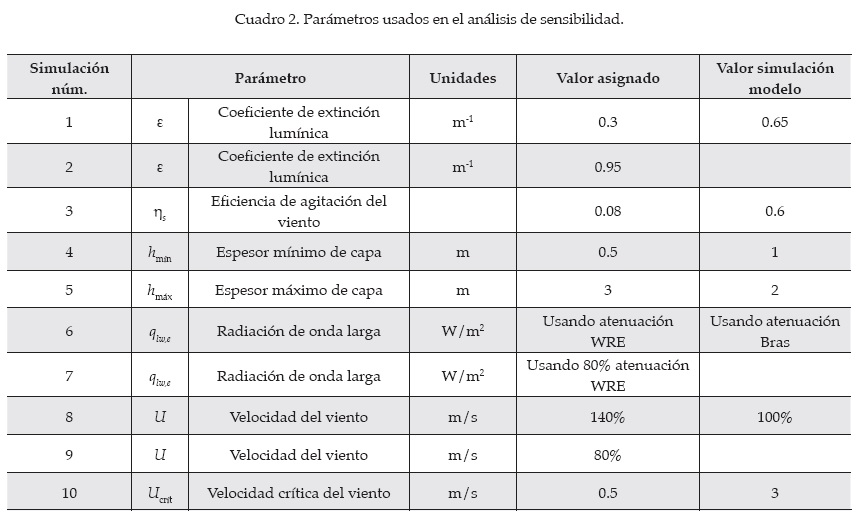 Para estimar el impacto potencial de los datos inciertos sobre los resultados del modelo, así como para probar la robustez del modelo con los cambios de datos de entrada o de los coeficientes asignados en la configuración del modelo (espesor de capas y coeficiente de extinción lumínica, entre otros), se hizo un análisis de sensibilidad que permite determinar los factores que más afectan la estructura térmica del embalse. El análisis de sensibilidad se realizó comparando los valores de temperatura en la columna de agua de una simulación modelo, con los valores de otras simulaciones, cambiando algunos parámetros (cuadro 2). Se usaron dos mediciones de sensibilidad para la interpretación de los resultados del modelo, las cuales se tuvieron en cuenta para evaluar los cambios en las concentraciones medias en la columna de agua y los cambios en la distribución vertical, esta última debido a que las concentraciones medias pueden permanecer sin cambios aun cuando la distribución vertical sí los presenta.