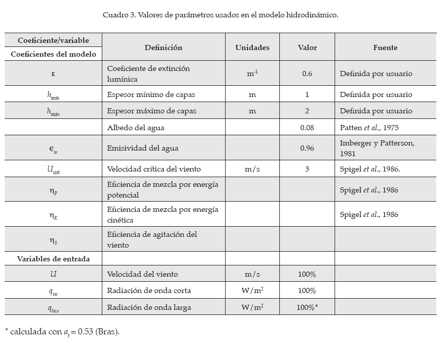 La velocidad crítica del viento, Ucrít, así como el coeficiente de agitación del mismo, no representaron cambios significativos durante el análisis de sensibilidad, por lo tanto no fueron alterados sus valores (cuadro 3), que son los recomendados por el CWR, y que han sido usados con éxito en otros lagos y embalses (Hornung, 2002). Además, en la mayor parte del tiempo no se supera la velocidad de viento crítica Ucrít establecida por el modelo.
