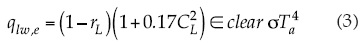 Donde rL es el coeficiente de refracción de onda (0.03); σ, la constante de Stefan-Boltzmann, con valor 5.6696x10-8 W/m2K4;Ta, la temperatura del aire en grados Kelvin, y Єclear es la emisividad de la atmósfera sin nubes.