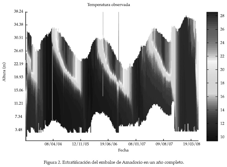 El embalse de Amadorio puede considerarse como templado monomítico, según la clasificación de Hutchinson (1957). La temperatura en el embalse fue medida a través de una sonda multiparamétrica autoposicionable (del tipo GOMMRER EU 2162) instalada en el cuerpo de agua (Prats i Vime y Correcher-Martínez, 2004). Gracias a dicha sonda, se cuenta con 1 251 días con datos desde julio de 2004 hasta octubre de 2008, y algunos días en los años 2002 y 2003. La sonda mide diferentes variables, como temperatura, oxígeno disuelto y pH en diferentes posiciones en cuanto a la superficie del agua. La figura 2 muestra la estratificación que se presenta en el embalse en un año completo. Como puede apreciarse en dicha figura, en los meses de invierno (diciembre a marzo), el embalse está completamente mezclado. A partir de abril se comienza a presentar una débil estratificación debido al calentamiento de la superficie del embalse. Progresivamente, en el mes de mayo, esta frontera se va haciendo más marcada y el gradiente de temperaturas es inestable.