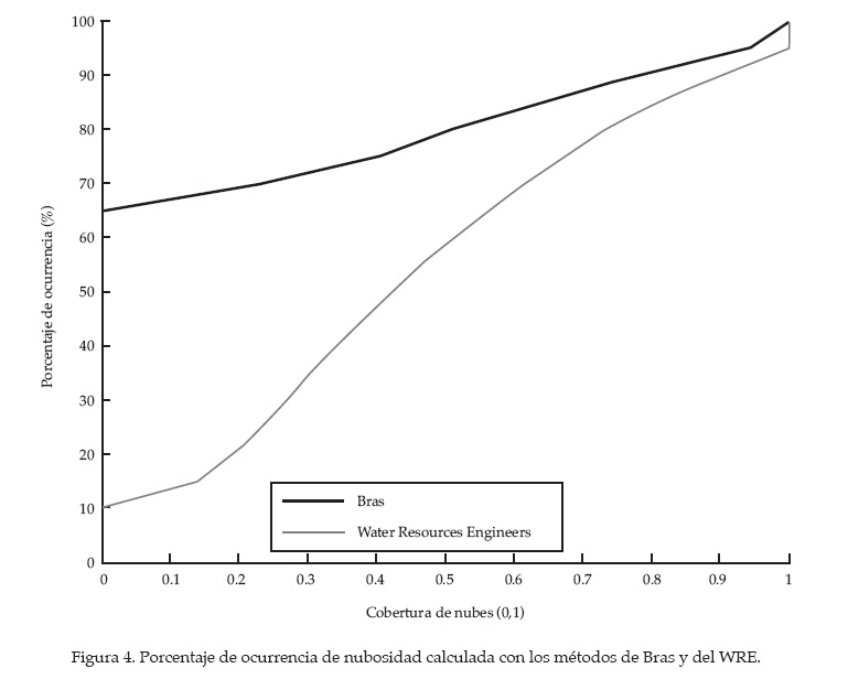 Existen múltiples métodos empíricos en la bibliografía científica para la estimación de la cobertura de nubes a partir de la fracción de la radiación solar no absorbida por las nubes. Se escogieron dos de los métodos más utilizados (Brown y Barnwell, 1987): el método de Bras y el del Water Resources Engineers (WRE). La figura 4 muestra el porcentaje de ocurrencia de nubosidad, calculado por ambos métodos. Se puede apreciar que el primer método representa el 70% de la veces una cobertura de nubes de 0.2, mientras que con el segundo método este valor sería de 0.6 aproximadamente, lo cual difiere bastante de la realidad, pues significaría que el cielo estaría un 60% cubierto por nubes el 70% del tiempo. Estos dos valores de nubosidad se evaluaron en el análisis de sensibilidad, ya que con ambos se obtenían diferentes valores de onda corta y larga, afectando, por lo tanto, la distribución térmica del embalse en el modelo. Usando la atenuación atmosférica de Bras (0.53 en promedio), la radiación de onda corta calculada no alcanza los picos máximos de la real, mientras que la del WRE (0.68 en promedio) sí la alcanza.