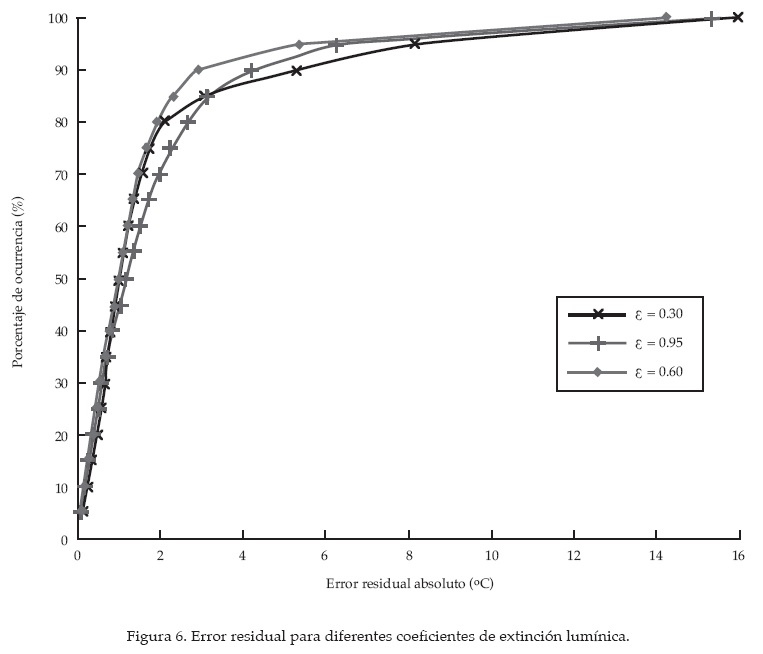 Como dicho parámetro depende de las condiciones de turbidez del embalse, no debería ser calibrado, pero dentro de la modelación de la temperatura se ve la importancia que tiene. Asimismo, el uso de un coeficiente de extinción lumínica constante para todo el periodo de simulación limita la correcta modelación del embalse, pues las poblaciones fitoplanctónicas y otros factores, como las partículas abiogénicas, introducen variaciones estacionales a dicho coeficiente, que no se ven reflejadas en el modelo, lo cual conlleva a una inexacta predicción de la temperatura, así como de otras variables. Para encontrar el mejor coeficiente de extinción lumínica, se modelaron los años 2005, 2006 y 2007 por separado y, a su vez, se comprobó que el problema de la mezcla en el hipolimnion no tuviera que ver con el periodo de simulación (seis años completos). En cada una de estas simulaciones por separado se encontró que el valor del coeficiente de extinción lumínica que presenta menor error residual absoluto es de 0.6. En la figura 6 se tiene el porcentaje de ocurrencia del error residual para diferentes coeficientes de extinción lumínica. Como se puede ver en la figura, el coeficiente de extinción lumínica presenta valores de ocurrencia inferiores al 90% para errores residuales superiores a 4 ºC. Sin embargo, tanto el coeficiente de 0.3 como el de 0.95 de las curvas de porcentaje de ocurrencia son más bajas, indicativo de que se tiene mayor error.