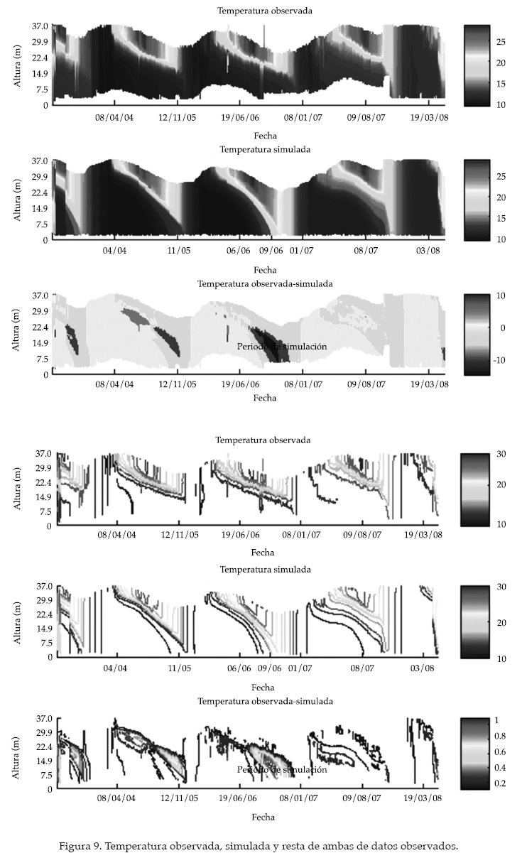 Los valores definitivos usados en la simulación se exponen en el cuadro 3. La calibración del modelo fue conducida comparando la temperatura media simulada con la media observada de los primeros 10 m desde la superficie para el epilimnion, y de los 17 m desde el fondo para el hipolimnion. De esta forma, las temperaturas simuladas en el epilimnion tienen un error medio de 1.4 °C, con desviación estándar de 1.2. El error medio en el hipolimnion es un poco mayor, siendo de 1.7 °C con desviación estándar de 1.2 y siguen siendo mayores las temperaturas simuladas que las observadas. El mayor error se presenta en otoño para las temperaturas del epilimnion, y en verano y otoño para las del hipolimnion.