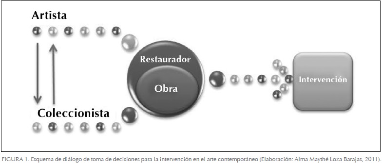 A continuación se muestra un gráfico del esquema planteado, en el que se observa, de izquierda a derecha, la relación entre el artista y el coleccionista, transmitida a través del restaurador, quien actúa -permítasenos insistir en ello- como intermediario por medio de la obra, con el fin de establecer las bases para la toma de decisiones de restauración de arte contemporáneo (Figura 1).