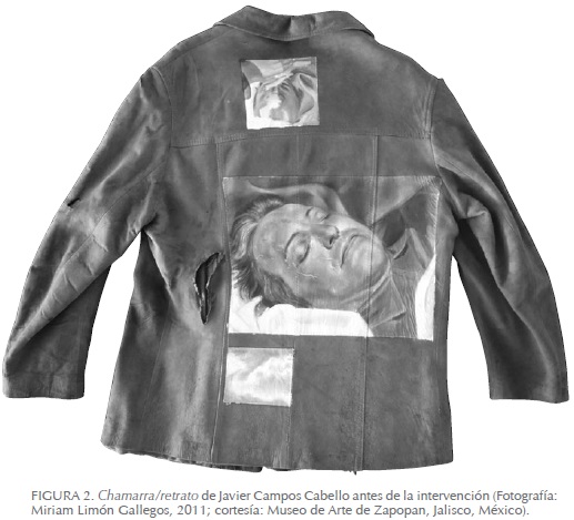 El primer paso para las restauradoras fue el acercamiento con la directora del museo, Alicia Lozano, dueña de la pieza y compañera del fallecido artista, Javier Campos Cabello (Figura 2), cuya finalidad consistía en comprender las características conceptuales de la pieza y su valoración. Con ello se consiguió saber que la chamarra originalmente perteneció a Campos Cabello, y que tras su muerte, en mayo de 1994, fuera parte de un homenaje, consistente en dedicarle un altar de muertos en las instalaciones del Instituto Cultural Cabañas (ICC). Fue entonces que Lozano le solicitó a Martha Pacheco, íntima amiga del artista que en ese tiempo trabajaba en su taller, hiciera algo "especial" para depositarlo en el altar. Pacheco tuvo la idea de realizar el retrato usando un peculiar soporte: una chamarra de gamuza que el pintor había usado con regularidad. La imagen plasmada se basó en las fotografías tomadas durante el funeral, que retrataban "la paz interior que reflejaba" el artista en su último lecho (Lozano 2012). La pieza, que se montó en el altar del 2 de noviembre de 1995, la usó en un par de ocasiones Lozano, y posteriormente permaneció en una vitrina en la casa de su dueña. No volvió a plantearse la posibilidad de su exhibición pública sino hasta 2011.