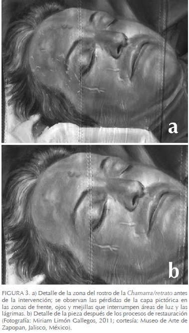 La decisión consensuada fue que las restauradoras llevaran a cabo la intervención: se creyó que era mejor que las especialistas realizaran ese proceso, ya que además de contar con los conocimientos teóricos y prácticos, entendían la relación entre la materia, el mensaje y la carga emocional. Así fue posible realizar la intervención; primero, colocando un soporte plano rígido en el interior de la chamarra/retrato, para facilitar su manejo y evitar futuras deformaciones; más adelante se realizó una limpieza superficial sobre la capa pictórica, ya que la suciedad adherida alteraba los colores, más evidentemente sobre los tonos claros, y finalmente la reintegración de color sobre las zonas de pérdida, usando gouache, aplicado a modo de nutrido. Cabe mencionar que la selección del material se realizó debido a pruebas de solubilidad previas, las cuales demostraban que las escamas de la capa pictórica eran susceptibles a solventes no polares, causando deformaciones e intensificando los desprendimientos; de ahí que se decidiera optar por un material que empleara como medio un solvente polar que además se integrara con las características de brillo y saturación de la superficie pictórica, considerando el gouache como la opción que cumplía con estos requerimientos, aparte de que, debido a las texturas de las áreas circundantes, el sistema de puntillismo hacía posible integrar el color a las zonas de pérdida (Roja de la Roja 1999: 35).
