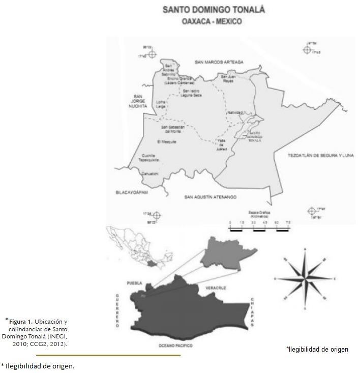 Área de estudio. Santo Domingo Tonalá es un municipio localizado en la región de la Mixteca Baja del estado de Oaxaca, México, en las coordenadas 97.96o oeste y 17.68o norte, a una altitud promedio de 1,390 msnm, con una superficie total de 17,096 hectáreas (Fig. 1) de las cuales 7,529 son utilizadas para la agricultura (Oviedo 2002), es decir, el 44% del territorio. Pertenece al distrito de Huajuapan de León y comprende las jurisdicciones municipales de San Juan de los Reyes, San Sebastián del Monte y Yetla de Juárez (INEGI 2010).