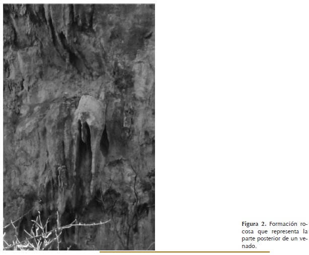 En lo que respecta a relatos y creencias, se registraron diversas historias en donde los pobladores cuentan que en el monte existen seres mágicos denominados "chaneques", mismos que se encargan de cuidar y curar a los venados. Aunado a los "chaneques", se tiene la creencia de que el monte es el "dueño" o "señor" del venado; lo anterior queda representado en una formación rocosa del cañón del Boquerón (Fig. 2). Dichas historias fueron contadas por ex-cazadores que actualmente se dedican a vigilar al venado. En otro trabajo realizado en la zona mixteca (Pérez-Hernández 2010), se encontró que el venado es el animal que cuida a los otros animales, por lo que es conocido entre los pobladores como "el Señor del Monte", hecho que refleja las diferencias en cuanto a creencias entre las comunidades (Ulloa 2002), incluso a pesar de estar presentes en la misma región.