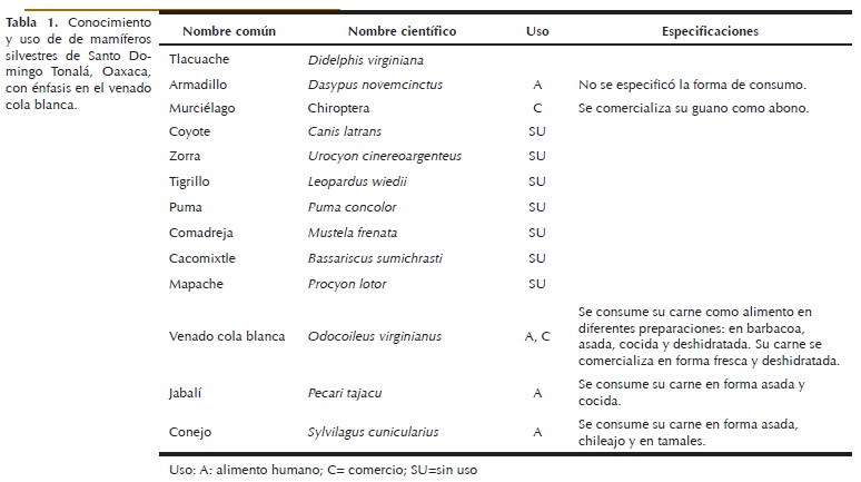 Los pobladores de Santo Domingo Tonalá conocen 13 especies de mamíferos silvestres de las cuales usan cinco (Tabla 1). Combinando los datos de Briones-Salas y Sánchez-Cordero (2004) y DOF (2008), Santo Domingo Tonalá cuenta aproximadamente con 17 especies de mamíferos silvestres, los cuales están enlistados en la Tabla 2. Al comparar ambos listados predominan más los mamíferos medianos y grandes entre los observados por los pobladores de Santo Domingo Tonalá, mientras que en Briones-Salas y Sánchez-Cordero (2004) y DOF (2008), aparecen en mayor proporción los mamíferos pequeños, principalmente ratones.