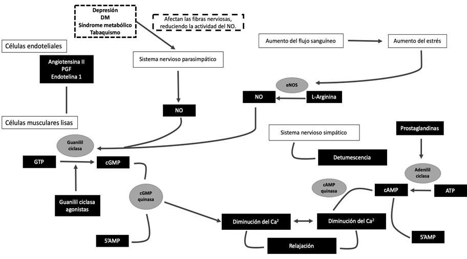 En condiciones normales, las erecciones son el resultado de una combinación entre respuesta de neurotransmisores y del musculo liso vascular, que generan el aumento del flujo arterial a los sinusoides cavernosos y células del musculo liso. Se conocen dos vías para la producción de óxido nítrico, principal factor involucrado en el proceso de la erección. Una de ellas es la estimulación de la sintasa de óxido nítrico endotelial (NOS) la cual aumenta la producción de NO, generando la disminución del calcio intracelular, con la consecuente relajación del musculo liso y aumento del flujo sanguíneo (ver figura 2).