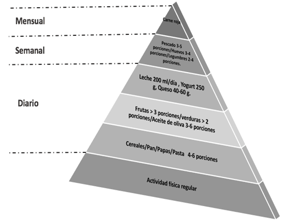 La Organización de las Naciones Unidas para la Educación, la Ciencia y la Cultura, clasificó la dieta mediterránea como un "patrimonio cultural de humanidad" la cual fue identificada en los hábitos alimenticios encontrados en algunas poblaciones (especialmente Creta y el sur de Italia) a mediados del siglo XX. En estas regiones, después de la segunda guerra mundial la nutrición fue escasa, por los bajos recursos que se presentaron como secuelas, caracterizándose por un consumo relativamente elevado de productos alimenticios como cereales, verduras, legumbres, nueces, frutas, aceite de oliva como principal fuente de grasa, frutos secos, consumo moderado a alto de pescado, consumo moderado a bajo de carne blanca (aves y conejo), productos lácteos (principalmente en forma de yogur o queso fresco), bajo consumo de carne roja y consumo moderado de vino con las comidas (Figura 3).18