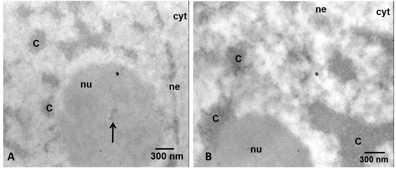Figure 3 Cell nucleus of C. revoluta (A) and C. mexicana (B), stained with uranyl acetate and lead citrate. A fibrogranular arrangement is observed in the interchromatin space (large arrows). In the cytoplasm (cyt), ribosomes are observed (small arrows). Chromatin (C), nuclear envelope (ne). Magnification, 30,000X.