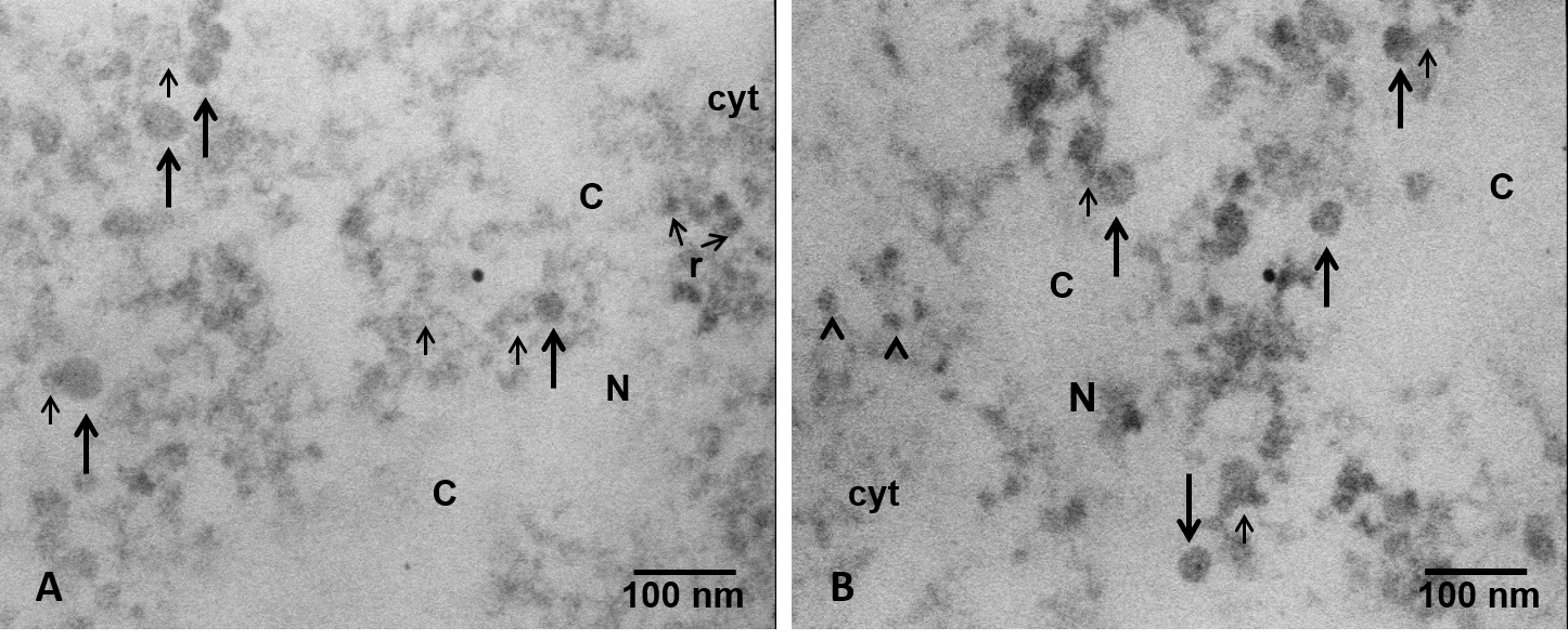 The cytochemical staining methods for electron microscopy have been a powerful tool for studying the ultrastructure of ribonucleoprotein particles in animal and plant cell nuclei (Bernhard 1969, Monneron & Bernhard 1969, Vázquez-Nin & Bernhard 1971, Echeverría et al. 1999, Segura-Valdez et al. 2020). The use of these approaches has allowed us to determine that the fine structure and cytochemical features of RNPs in the interphase nucleus of animal and plant cells are well conserved (Jiménez-García et al. 1989).