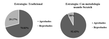 En cuanto al segundo aspecto, es decir, la evaluación de la cantidad de aprobados y reprobados, la figura 2 refleja los resultados generados de todos los cursos mediante porcentajes. Cabe mencionar que la cantidad de estudiantes evaluados con el método tradicional fue de 24 y al usar la metodología mediada con Scratch participaron 66 alumnos. De modo similar a la evaluación del promedio y mediana, en este segundo aspecto también se generó un aumento a favor de la metodología empleada (21.59 %). En consecuencia, la cantidad de reprobados es menor en los cursos donde se aplicó la metodología en comparación con los que fueron impartidos de modo tradicional.