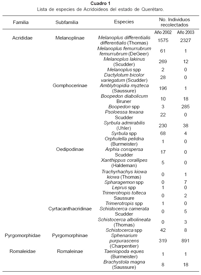 La especie que contribuyó en el 2002 con el mayor número de individuos fue Melanoplus differentialis differentialis con un poco más del 55 % de los ejemplares recolectados, le siguió Sphenarium purpurascens variegatum con 11.1 % , y Melanoplus lakinus con 9.3 %; Leprus spp, Orphulella pelidna, Taeniopoda eques, y Trimerotropis spp fueron las especies menos representadas con un individuo por especie. Igualmente en el 2003, el 64.2% de los ejemplares recolectados fueron de M. d. differentialis, el 24.6 % de Sphenarium purpurascens, y el 7.8 % de Boopedon diabolicum; en este año Taeniopoda eques, Amblytropidia mysteca, Melanoplus femurrubrum femurrubrum y Trachyrhachys kiowa kiowa contribuyeron con solamente un ejemplar cada una (Cuadro 1).