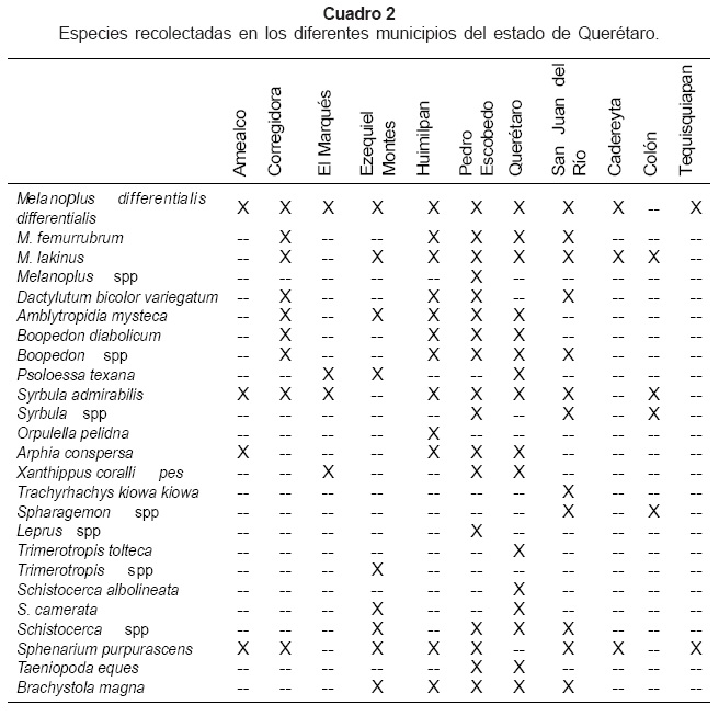 M. d. differentialis se recolectó en 10 de los 11 municipios (Cuadro 2), lo que muestra que es la especie más ampliamente distribuida, seguida de M. lakinus, S. admirabilis y S. purpurascens recolectados en ocho de los 11 municipios; las especies menos representadas fueron O. pelidna, Trimerotropis spp., T. k. kiowa, T. tolteca, Melanoplus spp., y Leprus spp, que se encontraron solamente en un municipio del estado de Querétaro. S. albolineata (= chinatiensis) se distribuye en Estados Unidos en los estados de Arizona, Nuevo Mexico y Texas; en México se ha recolectado en Sinaloa y Jalisco (Song 2004), éste es el primer reporte para el centro de México; S. camerata es una especie distribuida principalmente en México, aunque se ha reportado en el sur de Texas (Stidham & Stidham 2002) . El trabajo de Salas-Araiza et al. (2003) reportan erróneamente a la especie Schistocerca camerata como S. damnifica, Song (2004) señala que esta última se distribuye únicamente en el este de Estados Unidos y se distingue fácilmente por las antenas ensiformes.