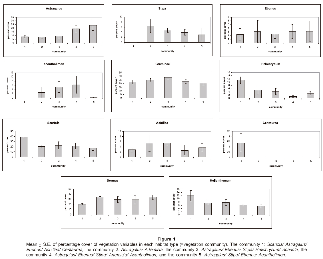 Vegetation composition of the habitats: Figure 1 shows mean ± S.E. of percentage cover of vegetation variables in each habitat type during six-month period. Cover of Helichrysum, Scariola, Centaurea and Helianthemum are highiest in habitat 1 and cover of Astragalus, Stipa, Ebenus, Graminae, Achillea and Bromus are high in habitat 5, 4, 3 and 2.