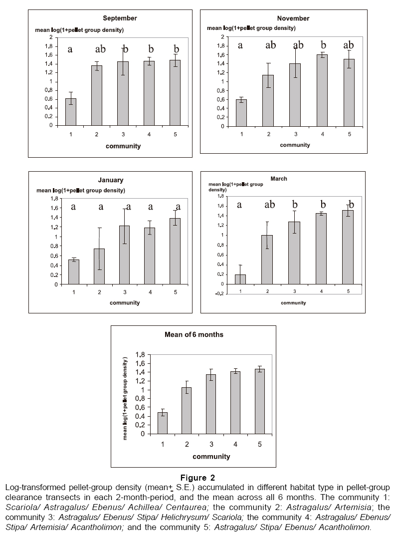 Significant relationships between the pellet-group density and vegetation variables by Pearson correlation matrix are given in Table 1. The results show that pellet-group density showed significant associations with Astragalus in all periods except March, with Stipa in September, with Helichrysum in all periods, with Scariola in September and November, with Centaurea in all periods except January, with Bromus in September and March and with Helianthemum in March.