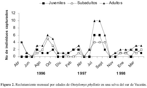 La dinámica de reclutamiento de O. phyllotis parece indicar que en el período de estudio se presentaron dos ciclos, ya que de agoto a noviembre de 1996 se presentó un máximo que incluyó las tres edades, lo mismo se observó de agosto a octubre de 1997 (Fig. 2). Los adultos fueron capturados durante la mayoría de los meses sin importar la época, como lo demostró la prueba de ANOVA, esto trae como consecuencia la entrada de jóvenes y subadultos que se enfatizó en la época de lluvias de 1996 y 1997, probablemente por la gran producción de frutos y hojas durante esta época, que les proporciona toda la energía necesaria para el proceso reproductivo. La presencia de adultos reproductivos se ha señalado como fundamental para mantener la sobrevivencia de las poblaciones, de Phyllotis darwini en Chile (Crespin & Lima 2006). Existen comportamientos particulares a cada sexo que muchas veces ocasionan su muerte o emigración influyendo en la dinámica del reclutamiento. Por ejemplo, en machos, la disminución o ausencia de individuos adultos quizá se deba a las presiones por encontrar y fecundar un mayor número de hembras para preservar sus genes. En contraste, las hembras se ven más interesadas en la búsqueda de alimento y refugios para garantizar el desarrollo de las crías (Bond & Wolf 1999, Jonsson et al. 2000, Kitchen et al. 2000). Esto se documentó en el área de estudio para Heteromys gaumeri (Hernández-Betancourt et al. 2003).