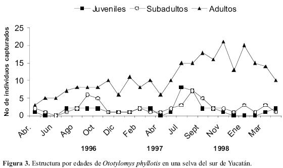 El análisis de edades por sexo siguió el mismo patrón que la estructura por edades total. El máximo de machos adultos (13 ind.) se presentó en septiembre de 1997 y el de las hembras en enero de 1998 (11 ind.). En abril y mayo de 1996 no se capturaron machos, en contraste, las hembras se capturaron durante todo el estudio, con fluctuaciones de dos a 11 individuos.