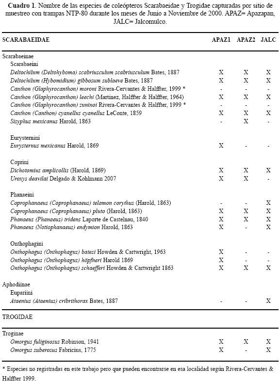 En muestreos utilizando trampas pitfall con excremento vacuno como cebo, realizados en los mismos sitios se han colectado 25 especies de Scarabaeinae (EMO datos no publicados) de las cuales 14 (56%) son comunes a este trabajo. Las once especies "faltantes" son consideradas estrictamente coprófagas por lo cual no responden a las trampas NTP. Entre ellas se encuentran especies de los géneros Dichotomius, Canthidium, Copris, Pedaridium, Canthon, Pseudocanthon, Onthophagus, y dos especies no nativas, Euoniticellus intermedius Reiche y Digitonthophagus gazella F. (EMO datos no publicados). Además de ellas, otras especies que no se registraron en nuestro trabajo están Canthon (Glaphyrocanthon) moroni RiveraCervantes & Halffter, especie aparentemente necrófaga muy rara conocida solo por un ejemplar macho de Jalcomulco (450m), y Canthon (Glaphyrocanthon) zuninoi RiveraCervantes & Halftter, especie copronecrófaga de interior de bosque, conocida solo de Jalcomulco (45 0m) (RiveraCervantes & Halffter 1999). Por su parte Canthon (Glaphyrocanthon) leechi coexiste con C. (G.) zuninoi y puede ser confundido con éste, a pesar de ser de zonas desmontadas y de borde de bosque. Sin embargo, ninguno de los ejemplares analizados pertenecientes al subgénero Glaphyrocanthon mostraron las características determinantes de C. (G.) zuninoi (élitros y pronoto brillantes, quilla supraclipeal continua, borde lateral del pronoto próximo al ángulo medio, ligeramente cóncavo, borde de la proepisterna con reborde y machos sin tuberculito entre los trocánteres III); caso contrario para C. (G.) leechi.