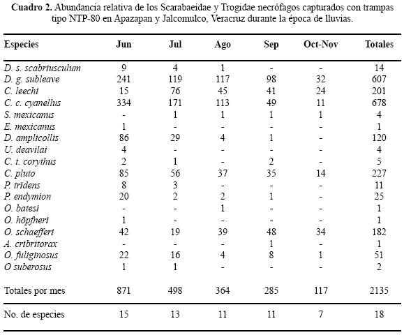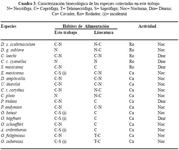 Hábitos. Las especies consideradas como necrófagas especialistas, dada la abundancia con que fueron colectadas son Canthon cyanellus, Deltochilum gibossum, Coprophanaeus pluto. En tanto las especies con abundancia intermedia a baja son consideradas copronecrófagas o coprófagas no estrictas, esto es, especies más generalistas que son atraídas por el cebo utilizado en esta ocasión (Cuadro 3). Aquellas especies con apenas uno o dos individuos no son consideradas precisamente necrófagas sino que tienen una afinidad mayor hacia la coprofagia o saprofagia y su captura es incidental.