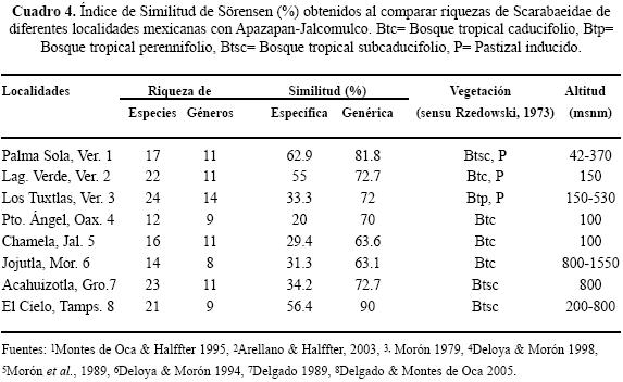 Relaciones faunísticas. Al comparar los componentes de esta fauna de Apazapan y Jalcomulco con otras faunas con vegetación tropical similar o equivalente por medio del índice de similitud de Sörensen, observamos a nivel genérico valores altos, mostrando porcentajes mayores al 60%. La región con mayor afinidad es la región de El Cielo (90%) y Palma Sola (81.8%). En segundo término algunas regiones presentaron porcentajes intermedios como, Laguna Verde (72.7%), Acahuizotla (72.7%), Los Tuxtlas (72%) y Puerto Ángel (70%). Por último, las regiones con porcentajes menores se observaron en Chamela (63.6%), Jojutla (63.1%).