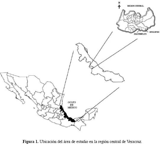Área de estudio. La región central baja de Veracruz se encuentra sobre las últimas estribaciones orientales del Cofre de Perote. Comprende dos municipios contiguos Apazapan y Jalcomulco (Fig. 1). El primero es recorrido por la barranca del mismo nombre; entre los 19° 19' N y 96° 43' O, con una altura media de 300 metros sobre el nivel del mar presentando una orografía irregular. Su clima es cálido subhúmedo, con una temperatura media anual de 25.5 ° C, con lluvias abundantes en el verano y a principios del otoño, y lloviznas en invierno por la influencia de vientos del norte. Su precipitación pluvial media anual es de 1,250 mm. Se encuentran suelos de tipos feozem (capa oscura, suave y rica en materia orgánica y nutrientes) y rendsina (capa superficial de materia orgánica que descansa sobre roca caliza) en los que coexisten el bosque tropical subcaducifolio con poblaciones de Cecropia peltata L. (guarumbo), Cecropia obtusifolia Bertol. (chancarro), Heliocarpus pallidus Rose (jonote), Heliocarpus mexicanus (Turcz.) (guanacaxtle), Enterolobium cyclocarpum (Jacq.) Griseb. y encinares (Quercus peduncularis Née, Q. polymorpha Schltdl. & Cham., Q. oleoides Schltdl.). Se desarrolla la agricultura, donde maíz, frijol, calabaza, plátano, cítricos y mango son los cultivos comunes, y en mucho menor escala la ganadería, principalmente bovina. Limitando al este con Apazapan, el municipio de Jalcomulco se ubica entre los 19°20' N y 96°46' O, a una altura media de 350 metros sobre el nivel del mar, encontrándose accidentes depresivos que forman las barrancas de Tuzamapan y Jalcomulco. Su clima es también cálido subhúmedo con una temperatura promedio anual de 24° C, lluvias abundantes en verano y principios de otoño. Su precipitación pluvial media anual es de 1,125 mm. Presenta suelos de tipo feozem, rendsina y luvisol (acumulación de arcilla en el subsuelo) donde se desarrollan el bosque tropical subcaducifolio y caducifolio con Ipomoea wolcottiana Rose (palo bobo), Lysiloma divaricatum (Jacq.) J.F. McBr. (rajador), Eysenhardtia polystachia (Ortega) Sarg. (vara dulce), Brosimum alicastrum (L.) Sarg. (chaca), Guazuma ulmifolia Lam. (guacima), Piscidia piscipula (L.) Sarg. (espino chijal) y Mimosa sp. (raspillo). Se practica en mayor porcentaje la agricultura (maíz, caña de azúcar, café y mango) y en menor proporción la cría de ganado. Esta región central baja es regada por el río de Los Pescados o de La Antigua, y presenta una marcada estacionalidad (época de lluvias: MayoOctubre; época de secas: NoviembreAbril, Fig. 2).