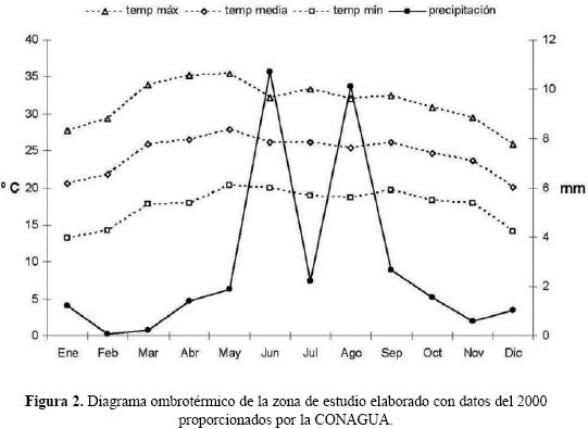 Recolecta. Los escarabajos necrófagos se colectaron en cada sitio mediante trampas tipo NTP80 (Morón y Terrón 1984) cebadas con trozos de calamar. La revisión de trampas y renovación de los cebos se realizó cada 30 días durante cinco meses a partir del inicio de la época de lluvias, iniciando a fines de Mayo y finalizando en Noviembre de 2000. Este período abarca la época de mayor actividad de los escarabajos. En la figura 2 se presentan las variables climáticas durante el período de muestreo.