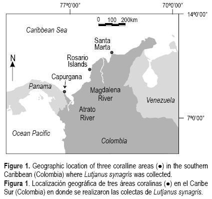 Se muestreó un total de 240 adultos de L. synagris (80 individuos/área) provenientes de la pesca artesanal en tres áreas coralinas colombianas del sur del Caribe, influenciadas por diferentes condiciones oceanográficas (Díaz et al. 2000, ver OspinaGuerrero et al. 2008): Santa Marta, Islas del Rosario y Capurganá (fig. 1). El muestreo se realizó durante octubre de 2004 para coincidir con la época de mayor abundancia de la especie y en sentido contrario al sistema de corrientes oceanográficas de la región para evitar capturar las mismas poblaciones en movimiento.