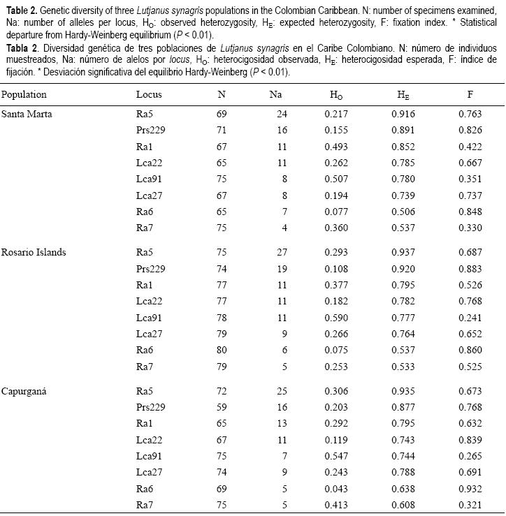 En este estudio se encontró un marcado déficit de heterocigosidad en todos los loci evaluados con la consecuente desviación del equilibrio HardyWeinberg. Esta deficiencia también ha sido reportada para algunos loci en Rhomboplites aurorubens (Bagley et al. 1999) e interpretada inicialmente como posibles errores de genotipificación por la presencia de picos fantasmas (Shinde et al. 2003), la dominancia de alelos pequeños (Wattier et al. 1998), o la presencia de alelos nulos (Shaw et al. 1999) aun cuando esta característica parece ser un rasgo común tanto en organismos marinos invertebrados (Ball y Chapman 2003, Sato et al. 2005, TelloCetina et al. 2005, R Pérez et al. 2006) como en vertebrados (Ovenden y Street 2003, Takagi et al. 2003, Clark et al. 2004, O'Reilly et al. 2004, A Pérez et al. 2006).