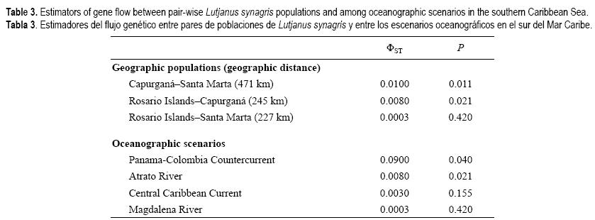 Se encontró una diferenciación pequeña pero estadísticamente significativa entre la población de Capurganá y las otras dos poblaciones geográficas tanto por AMOVA (ΦST en toda la población = 0.006, P = 0.022) como por SAMOVA(mejor FCT = 0.003, ΦST = 0.007, P = 0.0001). Se encontró un resultado similar cuando se evaluó el escenario oceanográfico entre Capurganá y las otras poblaciones (Río Atrato y la Contracorriente PanamáColombia; tabla 3, fig. 1). No se encontró correlación significativa entre la distancia genética y la geográfica (Rxy = 0.015, P = 0.142, R2 = 0.0002) entre las poblaciones de L. synagris evaluadas.