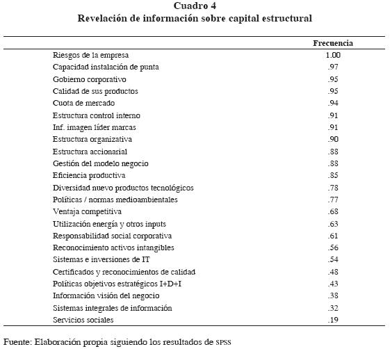 Para las empresas mexicanas es importante dar a conocer en primer lugar el aspecto interno que es el capital estructural. El cuadro 4 explica estadísticamente que los ítems que ocupan él más alto porcentaje de divulgación van de un 95% a 100%, los cuales se refieren a riesgos de la entidad, capacidad de instalación de punta, gobierno corporativo y calidad de productos.