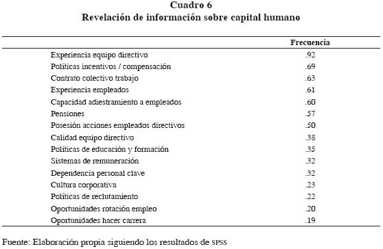 En el capital intelectual, el capital humano es el aspecto más importante porque forma la parte fundamental del conocimiento. Para las empresas mexicanas, el capital humano ocupa el último lugar en la divulgación de los activos intangibles. El cuadro 6 evidencia los aspectos importantes que se encuentran en un rango de entre 60% a 92%; se destaca primeramente la experiencia del equipo directivo; las políticas, incentivos y compensación; el contrato colectivo del trabajo; la experiencia de los empleados y la capacitación y el adiestramiento de los trabajadores. Los ítems menos importantes se encuentran entre un rango de 19% a 32%, los cuales corresponden a sistemas de remuneración, dependencia personal clave, cultura corporativa, políticas de reclutamiento, oportunidades de rotación de empleo y oportunidades de hacer carrera.