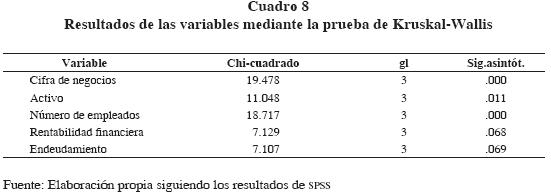 Para el resto de las variables se aplicó la prueba de KruskalWallis, cuyo objetivo consistió en comparar la tendencia central de varias poblaciones o niveles de tratamiento asignando y estableciendo los rangos a las puntuaciones de la variable. Dicha prueba reflejó los resultados que se presentan en el cuadro 8.