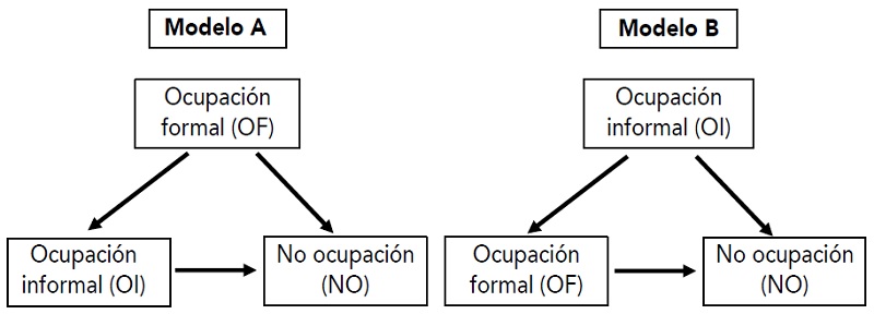 Los modelos multiestado cuantifican el riesgo y las probabilidades de los eventos a partir de la historia de los acontecimientos y los supuestos en torno a la manera en que suceden. Estos modelos se utilizan para analizar los cambios de los individuos entre diferentes eventos. Un modelo multiestado consta de varios eventos y transiciones. Un modelo simple consta de un estado inicial (con transiciones al intermedio y el absorbente), uno intermedio (con tránsito proveniente del inicial y otro hacia el absorbente) y otro absorbente (con tránsitos provenientes del inicial y del intermedio) (Geskus, 2016). Para el análisis de las transiciones laborales se utilizaron dos modelos, según se observa en el Esquema 1. En el modelo A el estado inicial es la OF, el transitorio corresponde a la OI, y el absorbente es la NO. Mientras que en el modelo B se parte de la OI, el estado transitorio es la OF y el absorbente la NO.