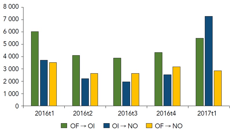 Como sugiere la teoría de los MLT, el mercado laboral es dinámico. En el periodo se registró un número elevado de transiciones laborales, en promedio 11 000 por trimestre. Como se observa en la Gráfica 2, destaca el alto número de transiciones laborales de la OF → OI y de la OI → NO, principalmente en el último trimestre. De menor importancia son las transiciones de la OF → NO.