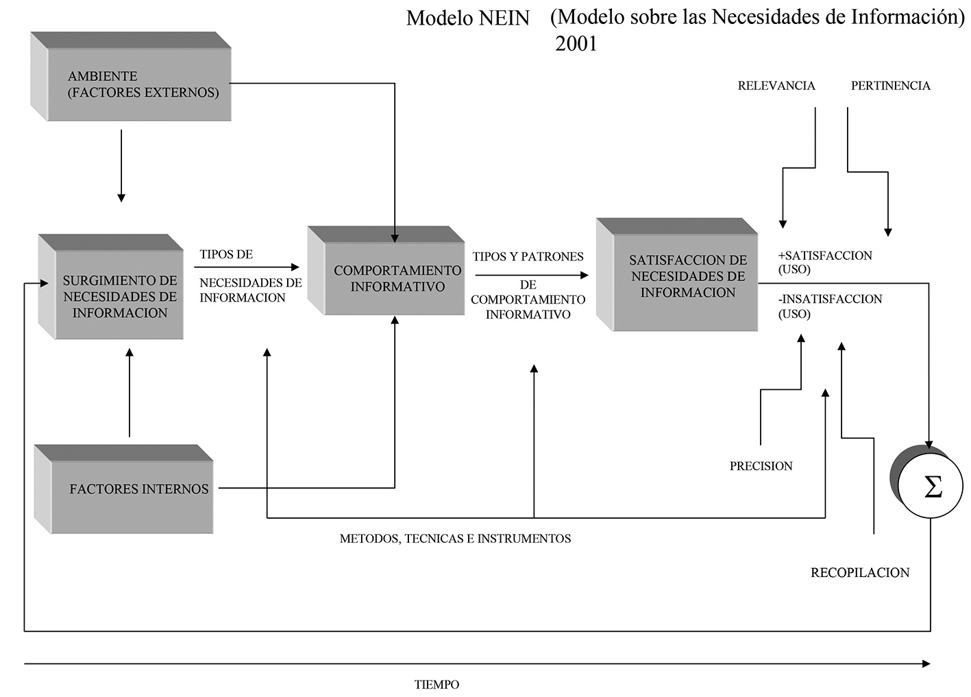 Tomando en cuenta las investigaciones previas y los marcos teóricos utilizados, así como las metodologías empleadas, esta investigación se sustenta en el ciclo de las necesidades de información representadas en el Modelo NEIN (véase la Figura 1) siendo el que se ajusta teóricamente a un estudio de este tipo, ya que contempla las fases de: