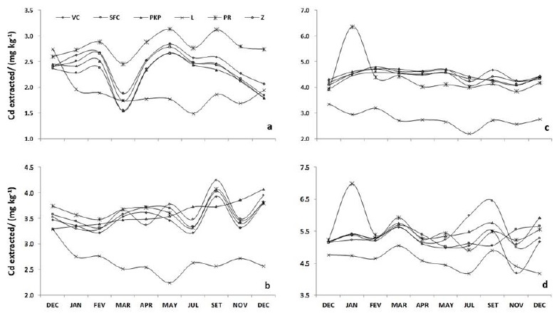 Lime addition resulted in smaller Cd release to soil solution as compared with the other soil amendments. Lime also produced a reduction trend in the available Cd content during the twelve months of the experiment, except for Cd extraction from the Red-Latosol in the months of March and September (Figure 1d).