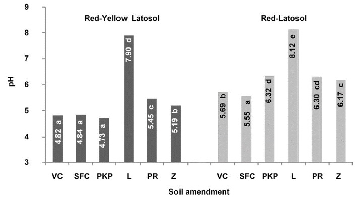 Figure 2: pH values of the contaminated soil/soil amendment mixtures obtained after a year-long incubation period. Vermicompost (VC), sugarcane filter cake (SFC), palm kernel pie (PKP), lime (L), phosphate rock (PR) and zeolite (Z). Mean of three replicates. Mean values followed by at least a same letter in the bars for each variable are not different at the 5% level, according to the Duncan’s test.