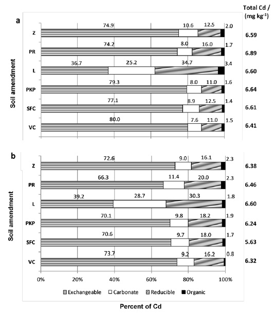 Figure 3: Cadmium partitioning in amended Red-Yellow Latosol (a) and amended Red-Latosol (b) with vermicompost (VC), sugarcane filter cake (SFC), palm kernel pie (PKP), lime (L), phosphate rock (PR) and zeolite (Z). Cadmium was not found in the residual fraction.
