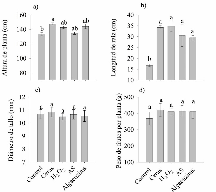 La aplicación de los bioestimulantes: H2O2, algas marinas y AS, no generaron diferencias estadísticas significativas en los valores de altura comparados con el control.