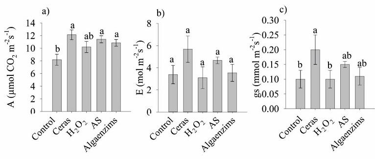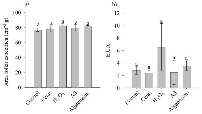Las plantas de frambuesa asperjadas con diversos bioestimulantes no presentaron diferencia significativa en EiUA, sin embargo, se aprecian diferencias numéricas indicando que con el uso de H2O2, las plantas son menos eficientes, puesto que necesitan más cantidad de agua para fijar CO2 (Figura 5b). Considerando que la hora de toma de lecturas fue al medio día, es importante destacar que esta condición soleada y su impacto en las plantas se aminora con la presencia de las ceras aplicadas en forma foliar por su efecto refractivo, ya que la EiUA está determinada por la radicación interceptada (Medrano et al., 2015).