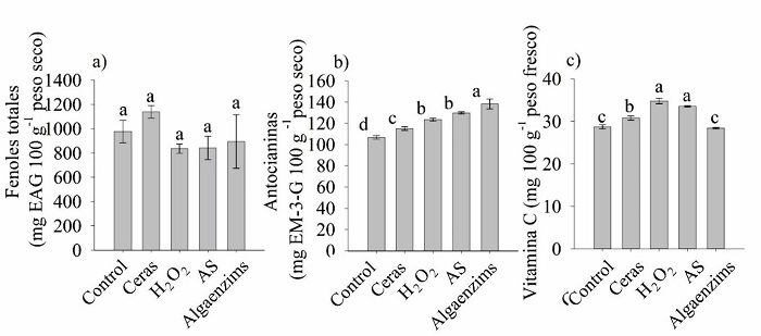 Figura 6: Efecto de bioestimulantes sobre el contenido (a) fenoles totales en equivalentes de ácido gálico (EAG), (b) antocianinas en equivalentes de malvidin-3-glucósido (EM-3-G) y (c) vitamina C en frambuesa sometida a estrés hídrico moderado (-0.8 MPa). Letras diferentes indican diferencias estadísticas significativas a P ≤ 0.05.