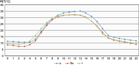 The largest difference in mean PET values is seen between U and R, as expected. Between areas, differences in mean PET values are smaller than those in the averages of maximum and minimum PET values. In terms of maximum PET values, SU represents warmer characteristics than U; however, in mean and minimum PET values U is the warmest area, which is consistent with the results of previous studies.