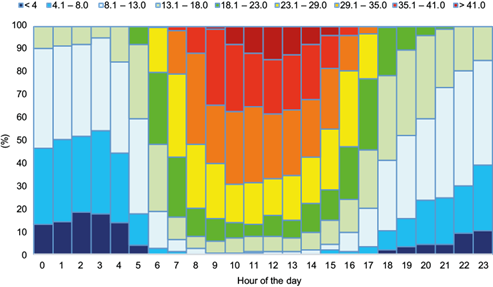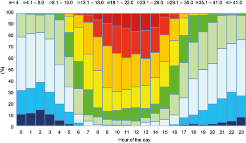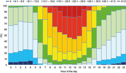 Figure 4 shows the hourly distribution of PET values in U over the whole study period. It is seen that cold and cool ranges (cold stress) are perceived from 19:00 to 04:00 LT (10 h) and between 09:00 and 16:00 LT (8 h) warm and hot ranges (heat stress) are dominant. The comfortable range spans only between 05:00 and 08:00 LT and 17:00 and 18:00 LT (6 h).