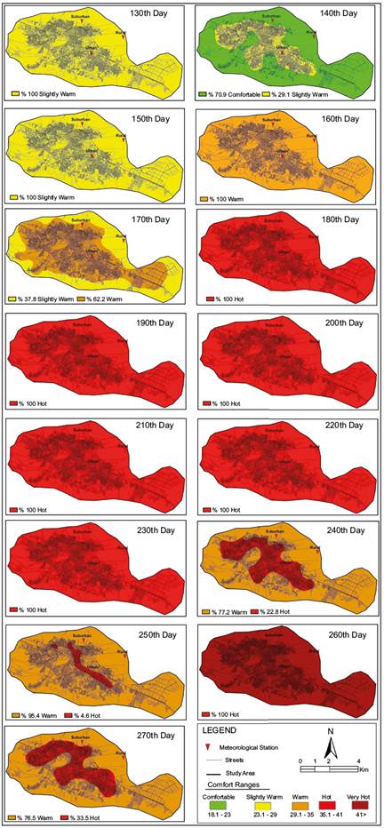 Figure 6 shows the hourly distribution of PET values in the rural area throughout the study period. Cool and cold ranges (cold stress) are seen between 18:00 and 04:00 LT (11 h) while warm and hot ranges (heat stress) are seen between 10:00 and 14:00 LT (4 h) and comfortable conditions are prevalent between 05:00 and 10:00 and 15:00 and 17:00 LT (9 h). Daily PET values were mapped at 10-day intervals to detect their spatial distribution in the city center according to the stations. It can be seen in this figure that slightly cool conditions are perceived in the whole study area when the spatial distribution of average daily PET values from day 130 to 150 day are considered. On day 160, 55.8% of the study area is in comfortable range, 44.2% is under the effect of slightly cool conditions, comfortable conditions are observed in the urban area. On day 170, 11.3% of the study area is in comfortable range and 88.7% is under the effect of slightly cool range. Comfortable conditions are determined to be prevalent in the areas covered by dense buildings and narrow streets in the city. This is because in the first and last months of the study period during nighttime and some hours of daytime, air temperature is lower in suburban and rural areas but higher in urban areas due to the UHI effect, which causes longer hours of calculated comfortable range. On the day 180, while slightly warm conditions (heat stress) are seen in densely built urban areas (3.5%), comfortable conditions are prevalent in the vast majority of the area (96.5%). Slightly warm conditions were determined in urban areas (32.8% of the whole study area) on day 190. Comfortable conditions were determined in 67.2% of the study area, covering rural and suburban areas. On day 200, a slightly warm stress was determined in the majority of urban and suburban areas and (60.6% of the study area). Comfortable conditions were perceived in rural areas and (39.4% of the study area). On days 210 and 220, a slightly warm stress was detected in the whole area. On day 230, a slightly warm stress was observed in the urban area, which accounts for 57.6% of the whole area. Comfortable conditions were experienced in the remaining 42.4% of the study area, corresponding to rural environments. On day 240, comfortable conditions were perceived throughout the whole area and on day 250 comfortable conditions were observed in urban and suburban areas. Comfortable conditions were detected in 61.7% of the area on day 250, while a slight cool stress was detected in the remaining 38.3% (rural settings). On day 260, a slight warm stress was experienced in the urban area (24.5% of the whole study area). Comfortable conditions were observed in 75.5% of the study area (suburban and rural). While the urban and suburban areas were comfortable on day 270, a slight cool stress was determined in the rural area (Fig. 7).